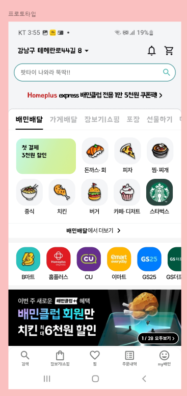 - Badges 영역: 검색, 장보기쇼핑, 찜, 주문내역, my배민