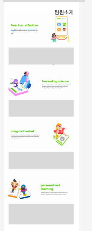 팀소개다음으로 팀원소개를 스크롤형식으로 볼수있게 디자인하는것을 목표로잡았다.(듀오링고를 레퍼런스하였다)