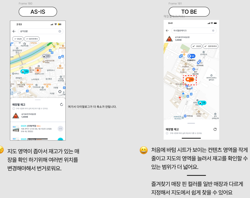 두번째 문제인 재고찾기의 지도 UI영역이 좁아서 재고가 있는 매장을 확인 하기위해 여러번 위치를 변경해야돼서 번거롭다는 문제는 처음에 바텀 시트가 보이는 컨텐츠 영역을 작게 줄이고 지도의 영역을 늘려서 재고를 확인할 수 있는 범위를 넓혀서 해결을 하였으며, 즐겨찾기 매장 핀 컬러를 일반 매장과 다르게 지정해서 지도에서 쉽게 찾을 수 있게 개선을 하였습니다.