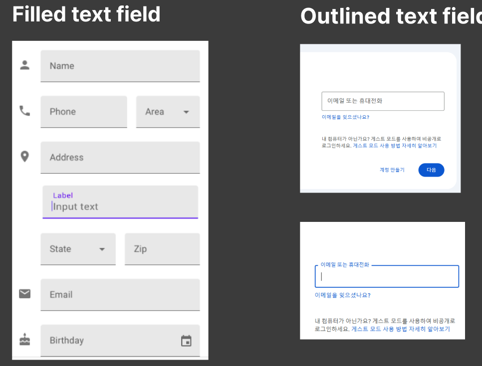 Filled text field 는 라벨이 텍스트 필드 내부에 표시되며, 필드가 포커스되면 위로 올라가고,