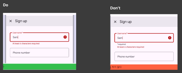 Don't의 문제점으로는 오류 텍스트 헬퍼 텍스트를 동시에 표시할 경우로