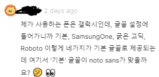 먼저 갤럭시의 기본폰트는 노토산스가 아니고 다른 폰트로 지정이 되있을수있다.