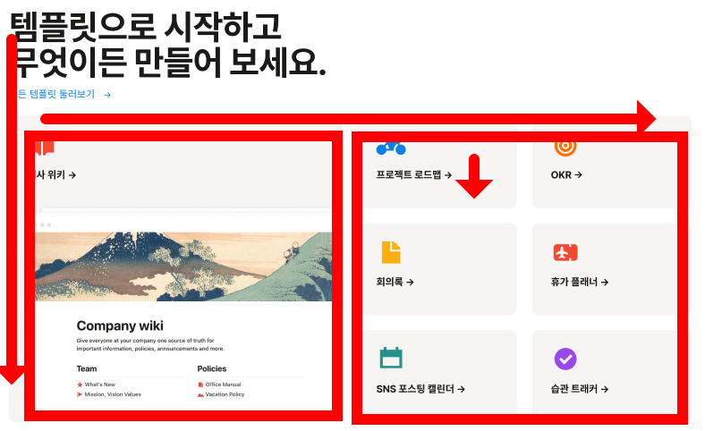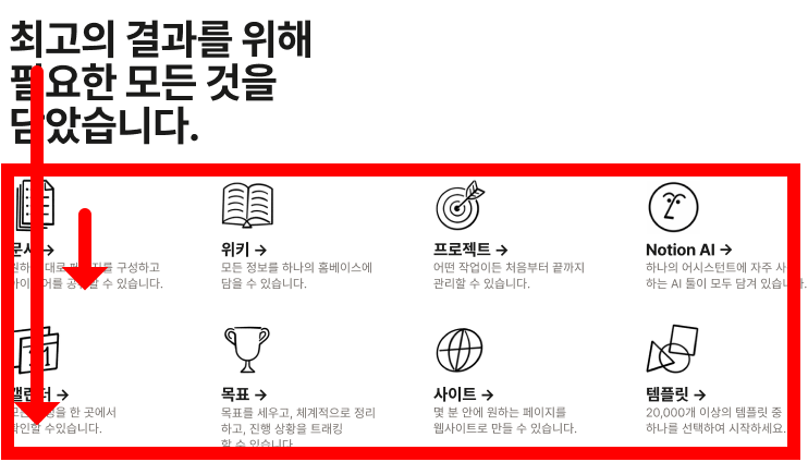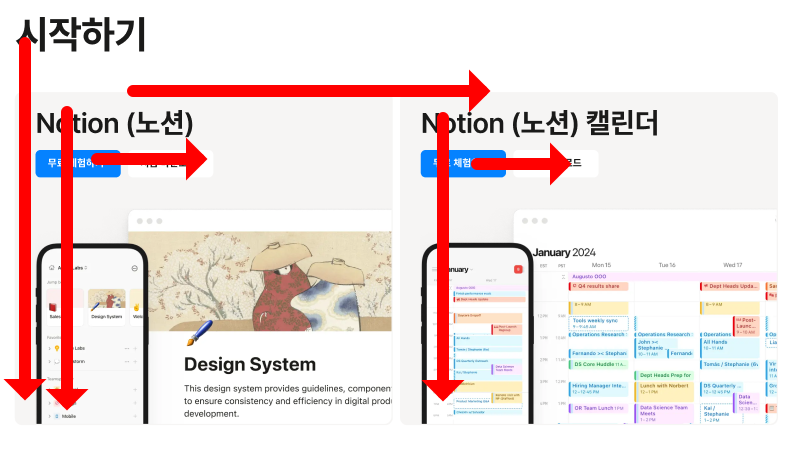 먼저 노션은 레이아웃이 header, hero section, 기능 소개 section, 시작하기 section, footer이 있다.