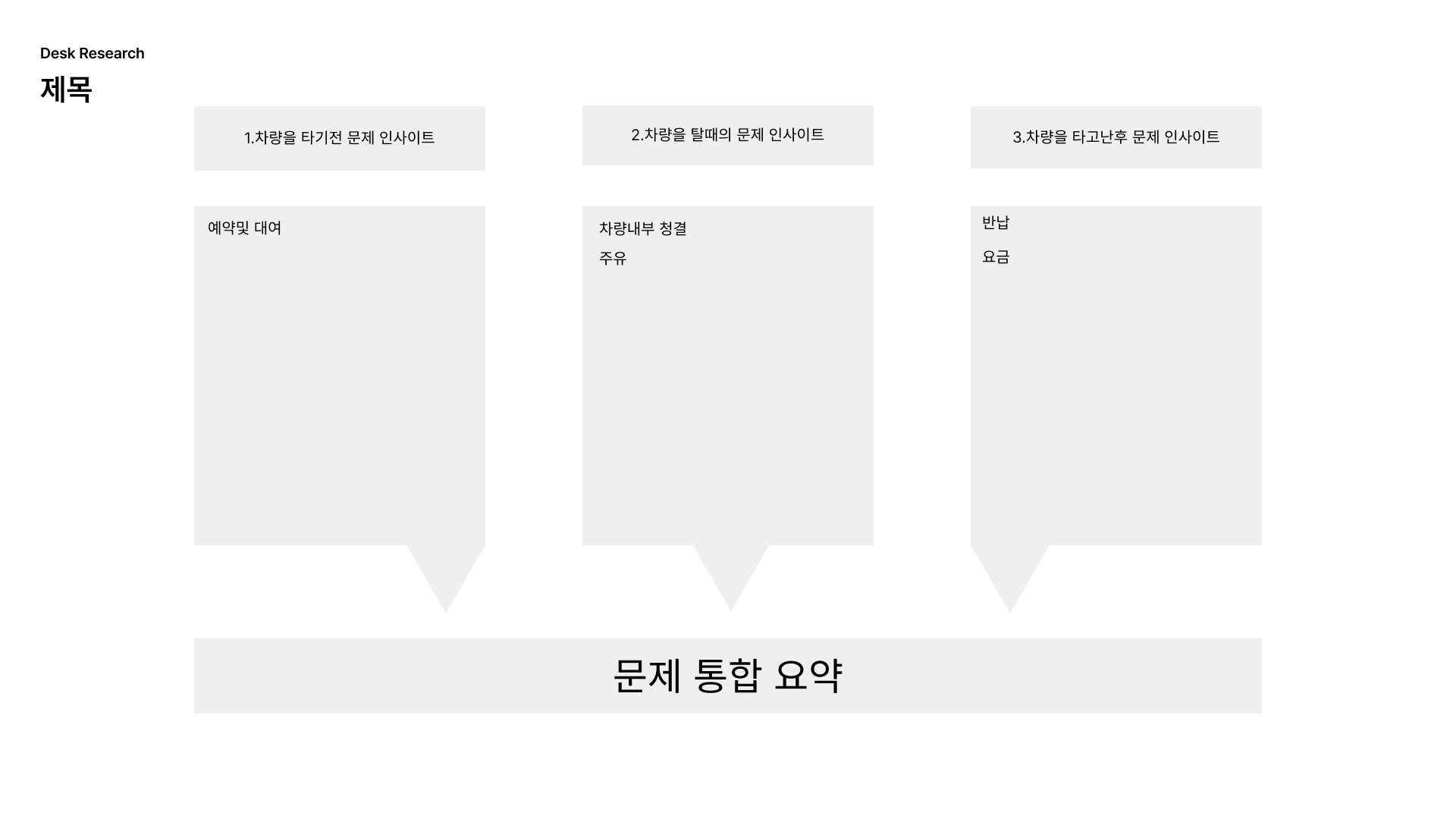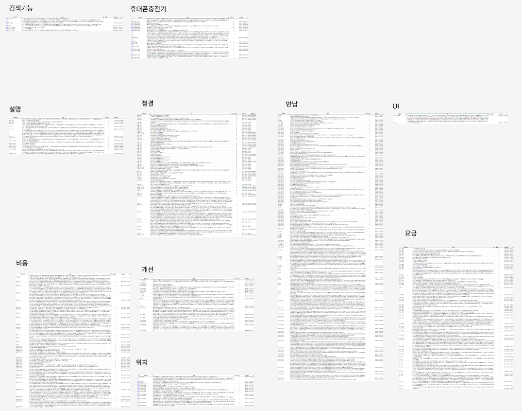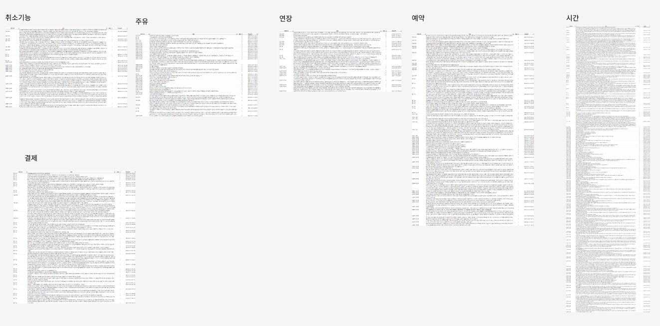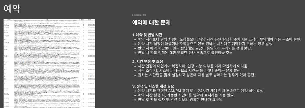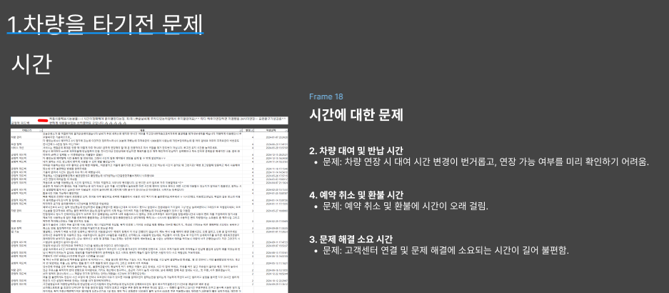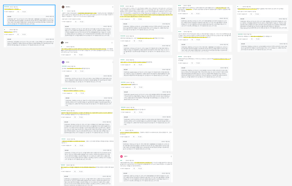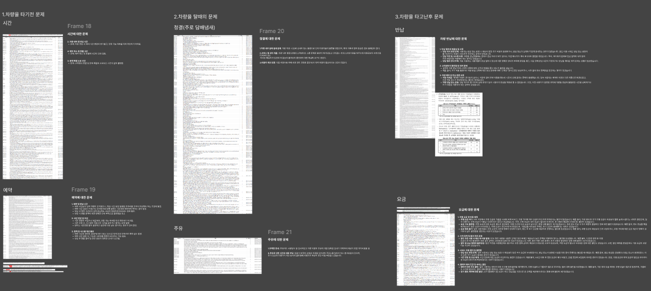 1.차량을 타기전 문제 2.탈때의 문제 3. 타고난후의 문제로 나누어 각 단계에서 발생하는 문제들에 대한 리뷰를 큰틀로 구분을 한다음리뷰가 많은 부분을 선별하여 인사이트를 작성하였다.