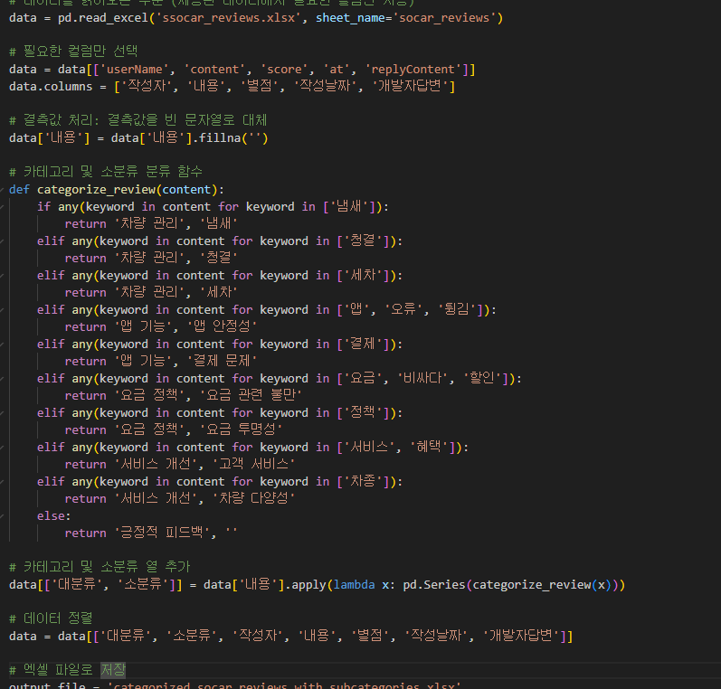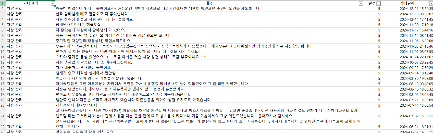VScode로 구글스토어 리뷰를 크롤링하여 나온 최근 1년치의 리뷰들을 전부 가져와서 엑셀파일로 정리를 하였다.