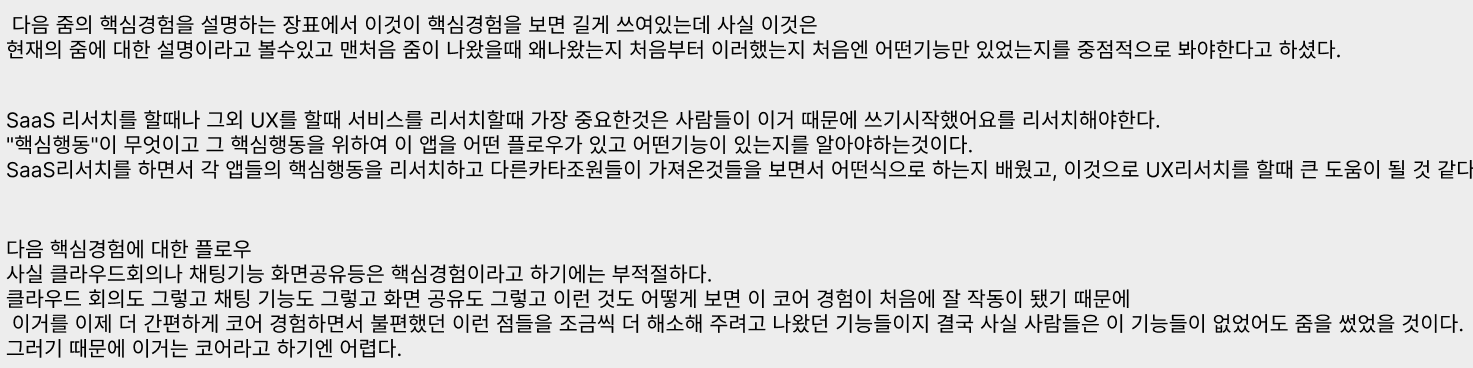 이때 SaaS 서비스를 리서치였는데, UX 리서치를 할때 가장 중요한것이 사람들이 이 앱을 무슨 기능때문에 쓰기 시작한지를 리서치하는게 중요하며, 그것이 핵심행동이고 그 핵심행동을 위하여 이 앱이 어떤 플로우가 있는지 어떤 기능이 있는지를 알아야한다는것을 다시금 생각이났다.
