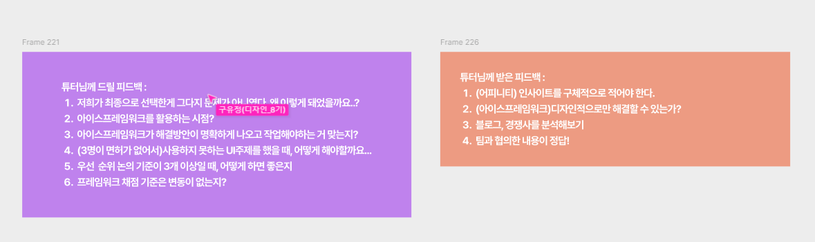 피드백을 바탕으로 우리는 일단 아이스프레임워크에서 나온 문제들중 순위가 높은것들중 정말 핵심가치와 직결되는 문제들을 토론후 다시 선별을 하였다.