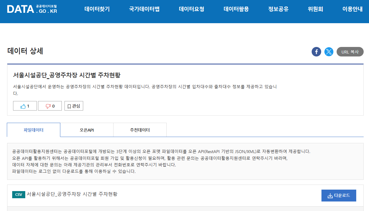 실제로 공공데이터포털에서는 서울시설공단의 공영주차장 시간별 주차현황데이터를 제공해주고있으므로 만약 사용할일이 있다면 이것을 사용해도 될것같다.