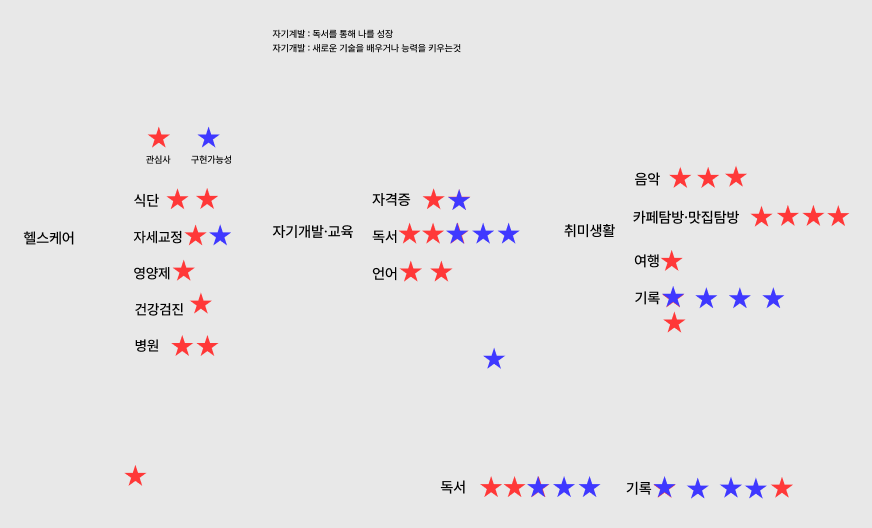 크게 헬스케어, 자기개발,교육,취미생활로 공통적인부분이 좁혀졌으며 그안에서 주제를 각자 투표를 함