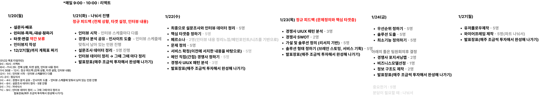 하지만 지금 우리는 디테일한 스케줄없이 큰틀로만 프로젝트를 진행하고있어서 중간중간 붕뜨는 시간도 있고, 효율적으로 시간을 사용하지 못했던것같다. 일단 튜터님의 피드백으로 우리는 전보다 디테일한 스케줄을 작성하였고,