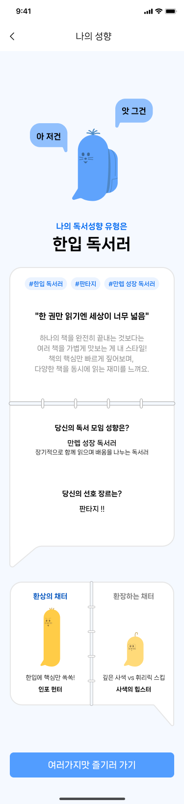 이것은 성향 결과 화면으로 여러 레퍼런스를 참고해서 최대한 브랜드 분위기와 어울리게 디자인하였다.