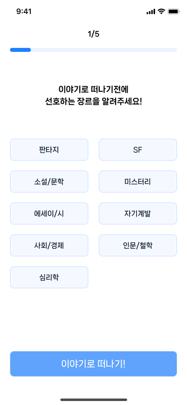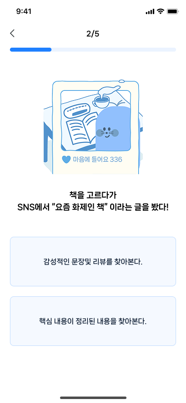 버튼과 프로그래스바 , 질문 선택지를 배치하였고, 배치를 할 때 선택지같은경우 최대한 사용자가 보기편하고 누르기 쉽게 넓게 버튼을